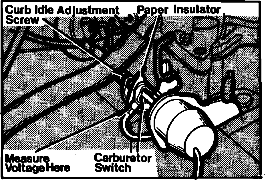 3. Place a piece of paper between curb idle adjusting screw and carburetor switch, see figure, or ensure curb idle adjusting screw is not contacting carburetor switch.