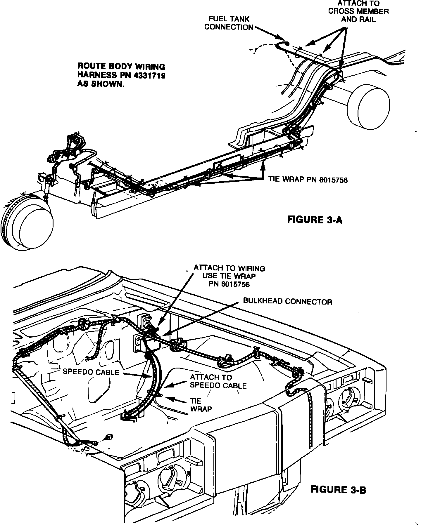 3. At the engine compartment, route and secure the body wiring harness to the speedometer cable using one (1) tie wrap and to the bulkhead wiring using one (1) tie wrap (Figure 3-B).