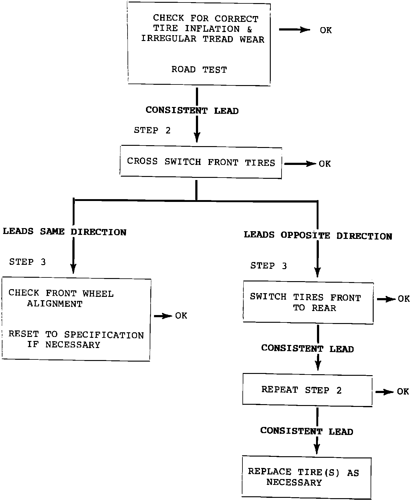 Lead conditions must be evaluated on a smooth, level, straight road (no crown) with minimum crosswinds, at a steady speed without acceleration. Use the attached chart to diagnose radial tire lead.