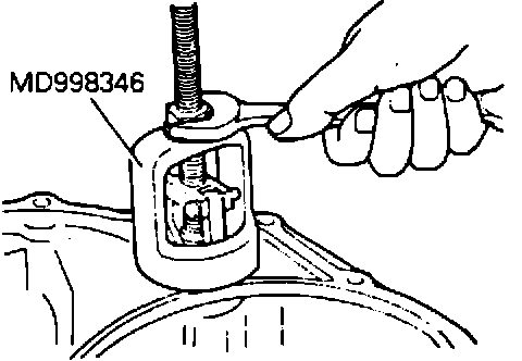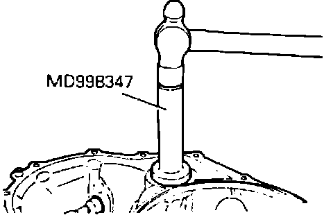 13. Position the transfer shaft spacer selected in Step 11 in converter housing bore. Using Special Tool MD998347, install transfer shaft bearing outer race in converter housing bore as shown in Figure 2.