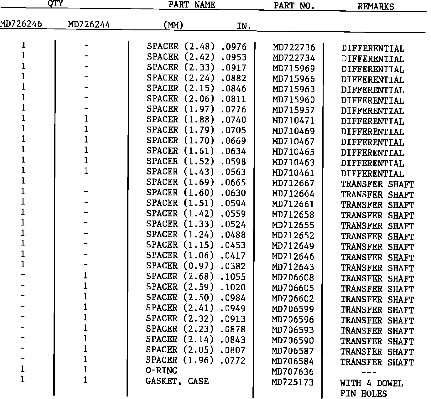 KM170 and KM171 transaxles built prior to December, 1986 (up to transaxle CK0520), use kit, PN MD726244. KM 172 transaxles built prior to May, 1985 (up to transaxle AQ4209), use kit PN MD726246.