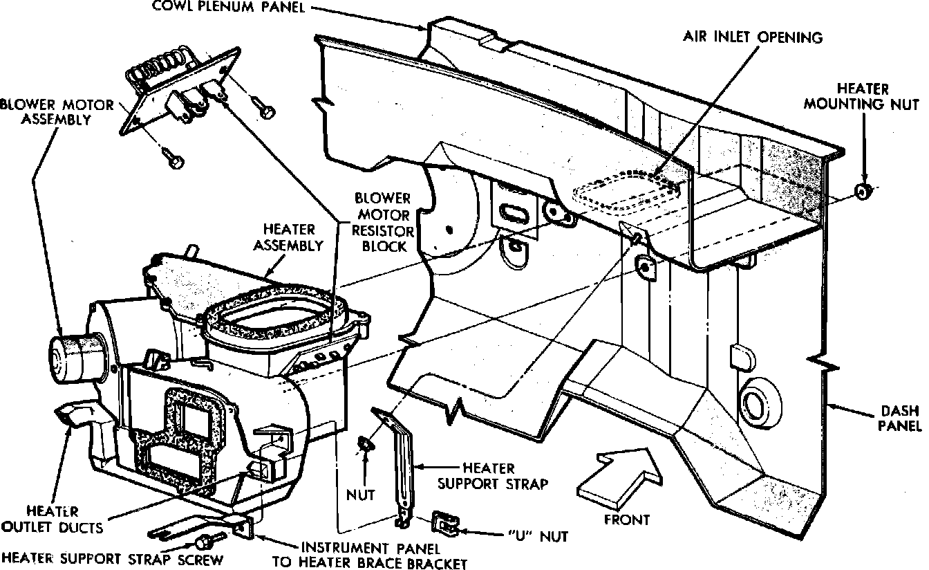 8. Remove heater support bracket nut, then disconnect strap from plenum stud and lower heater assembly from under instrument panel.