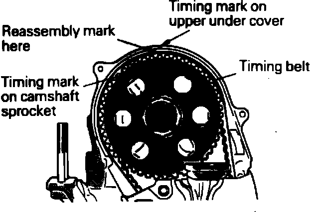 10. Remove timing belt upper front cover, then rotate crankshaft to bring No. 1 cylinder to top dead center compression stroke. The No. 1 cylinder is at top dead center compression stroke when the mark on the upper timing under cover is aligned with the mark on the camshaft sprocket, Fig. 4.