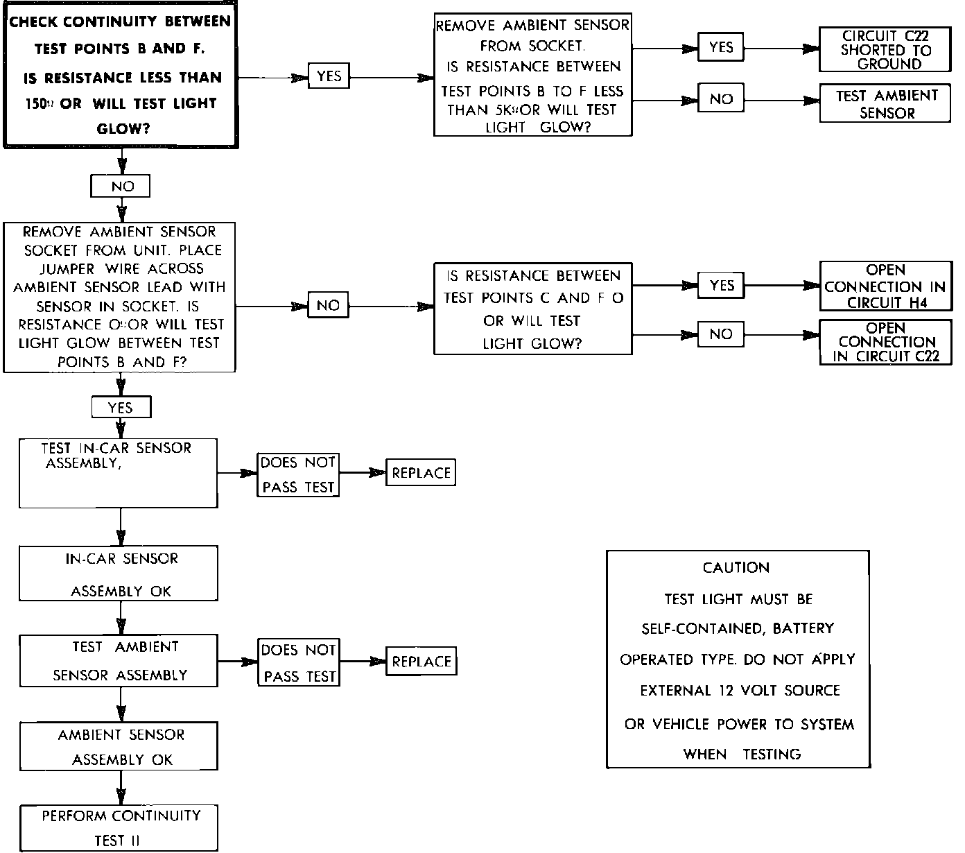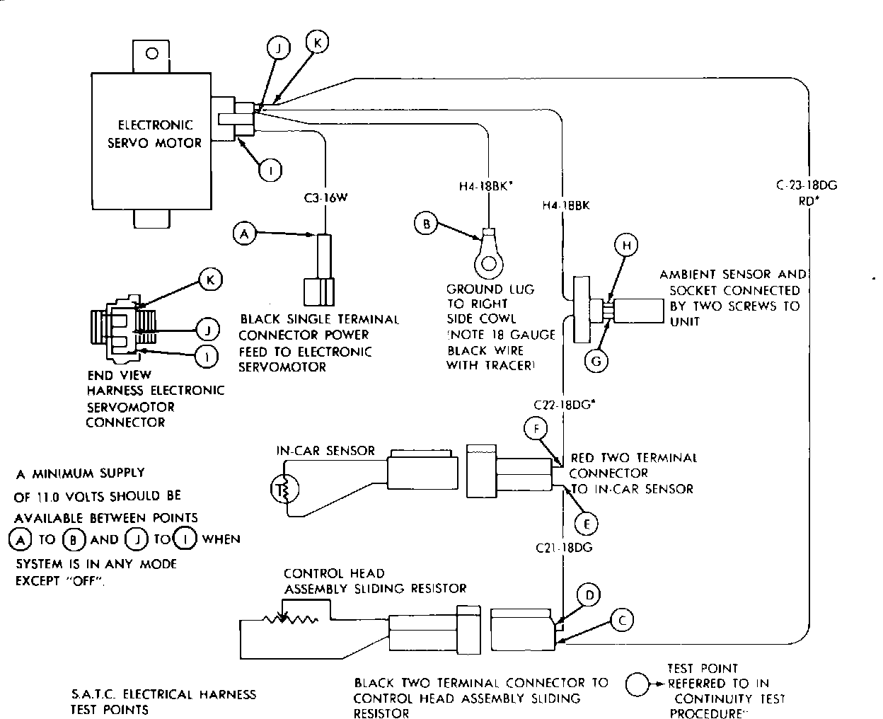 The glove compartment and righthand cowl trim panel must be removed before performing the continuity test. Check to ensure at least 11 volts is available at test points shown. Before testing system for continuity, disconnect power feed connector and in-car sensor. Refer to S.A.T.C Continuity Tests for procedures.