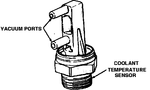 This switch, Figs. 4 and 6, provides manifold vacuum to the air switching system after a cold engine start until coolant temperature reaches a predetermined level. After the coolant temperature reaches this level, the switch closes and vacuum is cut off from the air switching system. The CCEVS/CVSCO is mounted in the thermostat housing.