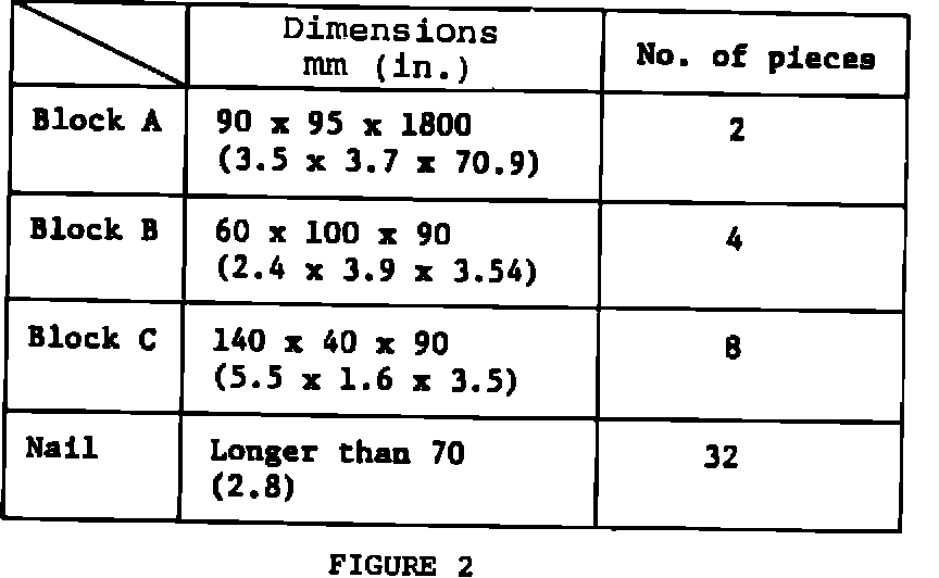 According to the specifications in Figure 2, cut pieces of wood to size (blocks A, B, and C). Place a block B between two pieces of block C as shown in Figure 3 and nail block C to B. Four of these units are needed, two for each block A. Do not nail these units into block A.
