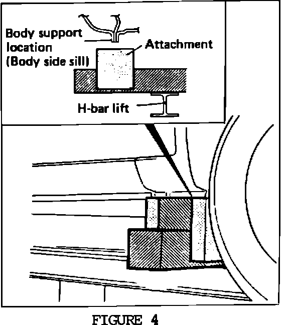These two finished units are to be placed across the rails of the lift. This will enable the vehicle to be supported on blocks B and C (Figure 4) by the body sill and not the frame rails.