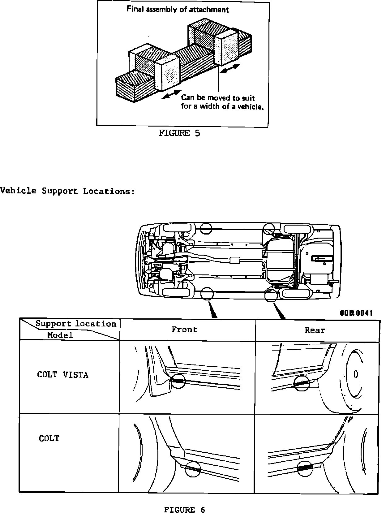 Position vehicle over and aligned with H-bar of lift. Place attachments (Figure 5) across the lift; one just in back of the front wheels, one in front of the rear wheels. Slide blocks B and C on each block A until they rest in the vehicle support locations shown in Figure 6.