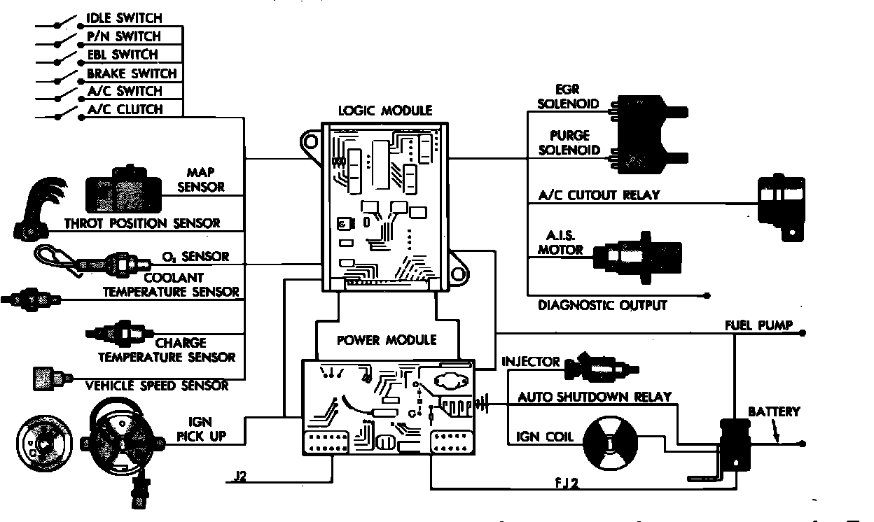 Various sensors and switches located throughout the vehicle provide information to the logic module, Fig. 1. All inputs to the logic module are converted to signals sent to the [1][2]power module. The power module is located on the left front fender well.Fig. 7 According to these signals, the power module changes fuel flow at the injector and/or ignition timing.