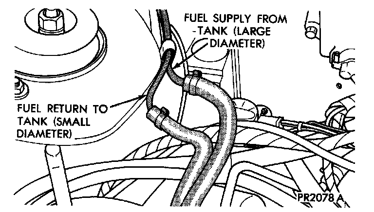6. On vehicles without fuel injection, disconnect fuel supply hose and connect either a portable holding tank or a siphon hose to the metal fuel supply tube at the right front shock tower. Drain fuel tank dry into holding tank or a properly identified "gasoline" safety container.