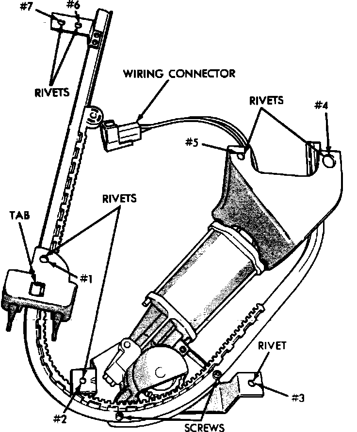 [1] Extreme caution should be used when working with any regulator that has a counterbalance spring. If the window is not secured in the "full up" position, removal of the power window motor will allow the counterbalance spring to move the sector gear very quickly. This could result in either personal injury or damage to the vehicle.