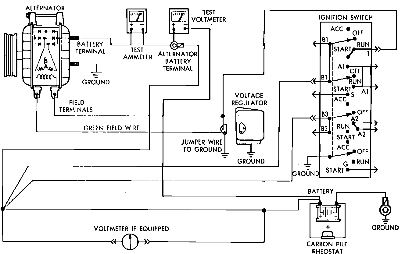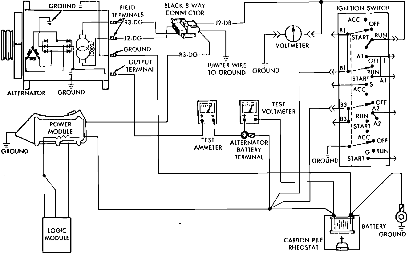 6. Adjust engine speed and carbon pile rheostat to obtain 20 amps in the circuit and check voltmeter reading. Reading should not exceed .5 volts. If a higher voltage drop is indicated, inspect, clean and tighten all connections in the circuit. A voltage drop test at each connection can be performed to isolate the problem.