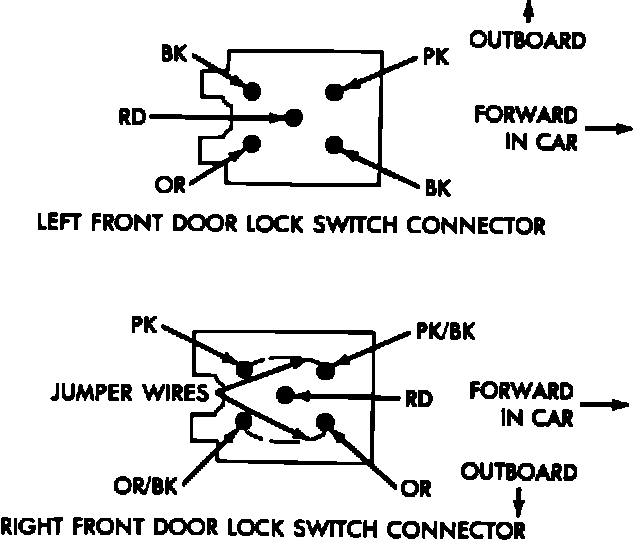 1. Remove the right door switch from the door panel and disconnect the wires from the back of the switch. Connect jumper wires as indicated to the right door wiring harness. These jumper wires take the place of the switch in the inactive position. Operate the door locks using the left door switch.
