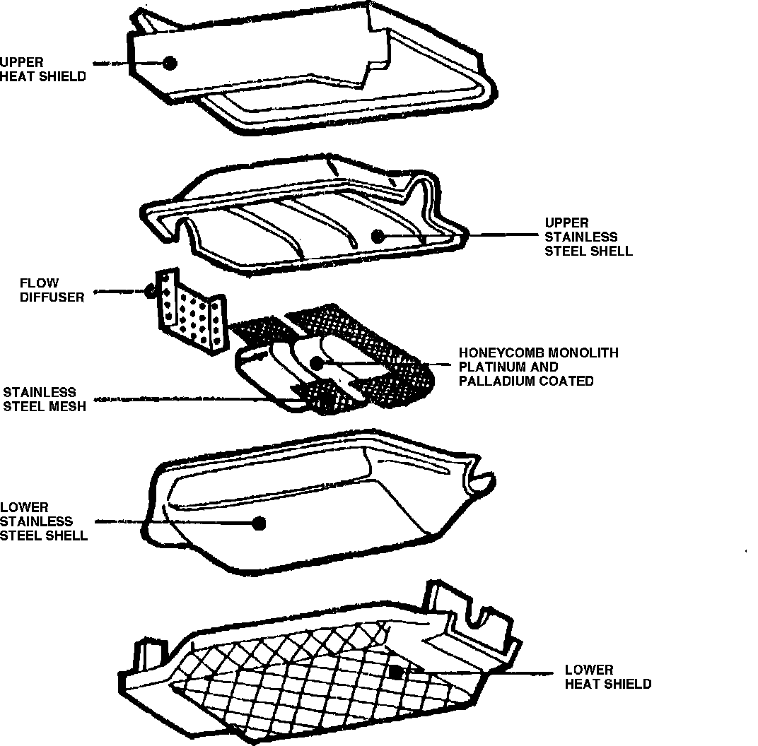 The catalyst is structured in the form of a honeycomb monolith, Fig. 7. The catalyst consists of a porous substrate of an inert material, coated with platinum and other metals, the catalytically active materials. This device, located in the exhaust system between the exhaust manifold and muffler, requires the use of heat shields, in some cases, due to its high operating temperatures.