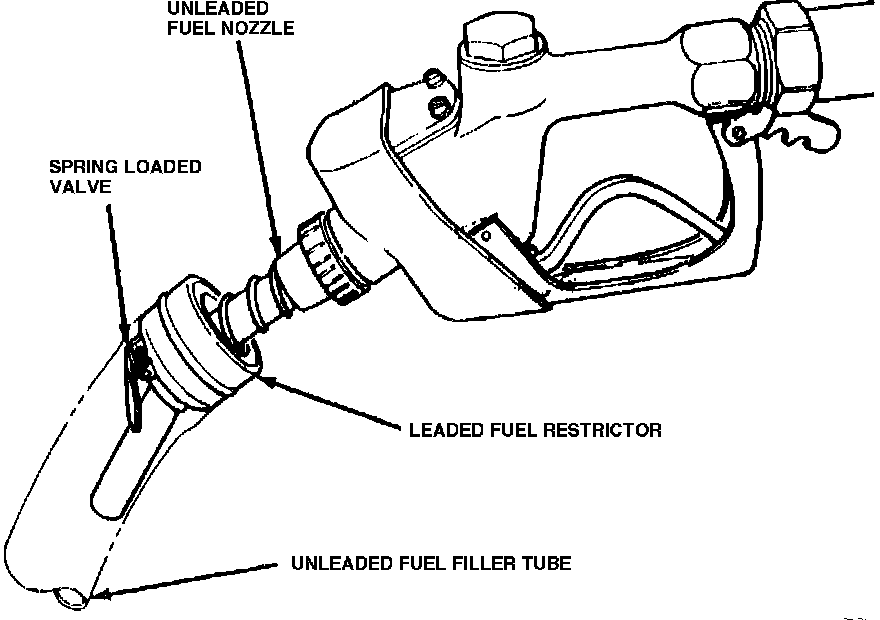 A smaller diameter fuel tank filler tube neck, Fig. 8, is incorporated to prevent the larger service station pump nozzle, used for leaded fuels, being inserted into the filler tube, thereby preventing system contamination. Since the use of leaded fuels contaminates the catalysts, deteriorating its effectiveness, the use of unleaded fuels is mandatory in vehicles equipped with catalytic converters. The catalytic converter can tolerate very small amounts of leaded fuels without permanently reducing the catalyst effectiveness.