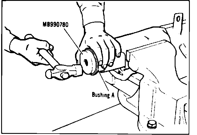 2. Apply grease to outer surfaces of bushings, then using tools Nos. MB990779 and MB990780, drive bushing B in until tool contacts end of left suspension arm. Using tool No. MB990780, drive bushing A into left suspension arm.