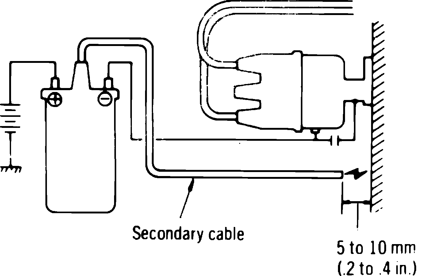 1. Disconnect coil wire high tension lead from distributor cap, then hold wire approximately .2-.4 inch away from cylinder block, Fig. 1.