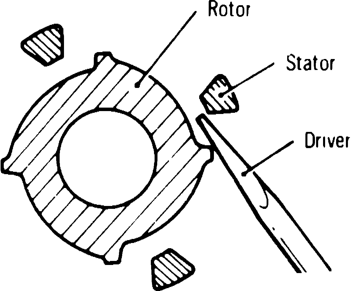 1. Disconnect coil wire high tension lead from distributor cap, then hold wire approximately .2-.4 inch away from cylinder block, Fig. 1. Remove distributorcap, then turn rotor in direction of engine rotation (clockwise) by hand until rotor contacts stop. Return rotor to its original position. Spark can be produced by moving projection of the signal rotor close to the stator, Fig. 1.