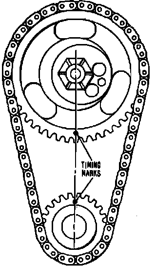 To install chain and sprockets, lay both the camshaft and crankshaft sprockets on the bench. Position the sprockets so that the timing marks are next to each other. Place the chain on both sprockets, then push the gears apart as far as the chain will permit. Use a straightedge to form a line through the exact centers of both gears. The timing marks must be on this line, Fig. 12.