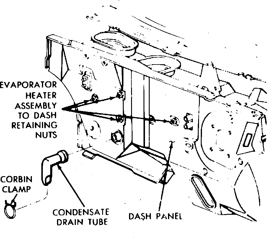 5. Remove drain tube and evaporator heater assembly to dash retaining nuts.