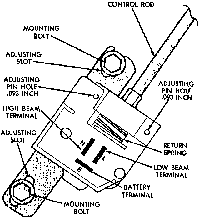 3. To install switch, firmly seat pushrod into switch, then compress switch until two .093 inch drill shanks can be inserted into alignment holes. Position upper end of pushrod in pocket of washer/wiper switch. This can be done by feel, or if necessary, by removing lower column cover.