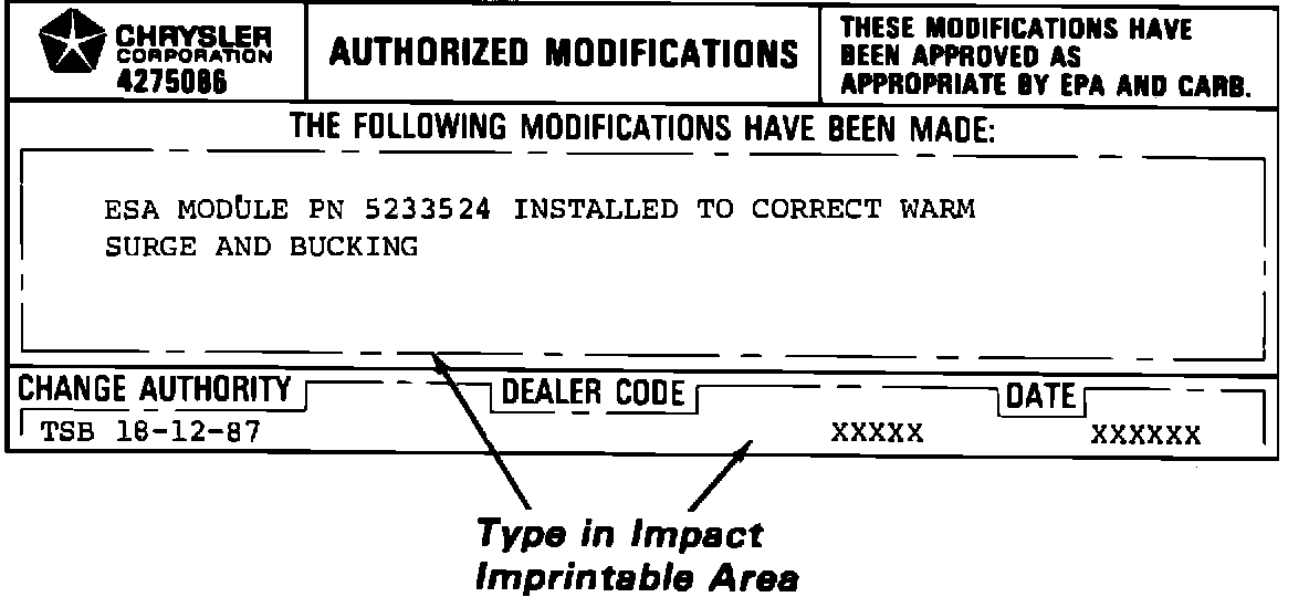 This repair will reduce the above conditions by installing a revised ESA module to allow a slightly richer fuel mixture during periods of high vacuum and high rpm. ESA module, PN 5233524, also includes all of the prior improvements made to the original ESA module for cold start driveway dieouts and cold sag on acceleration.