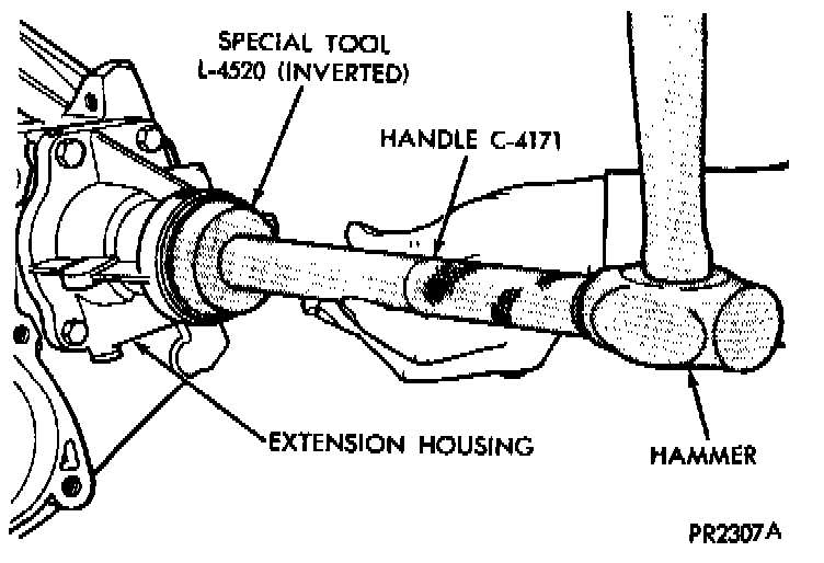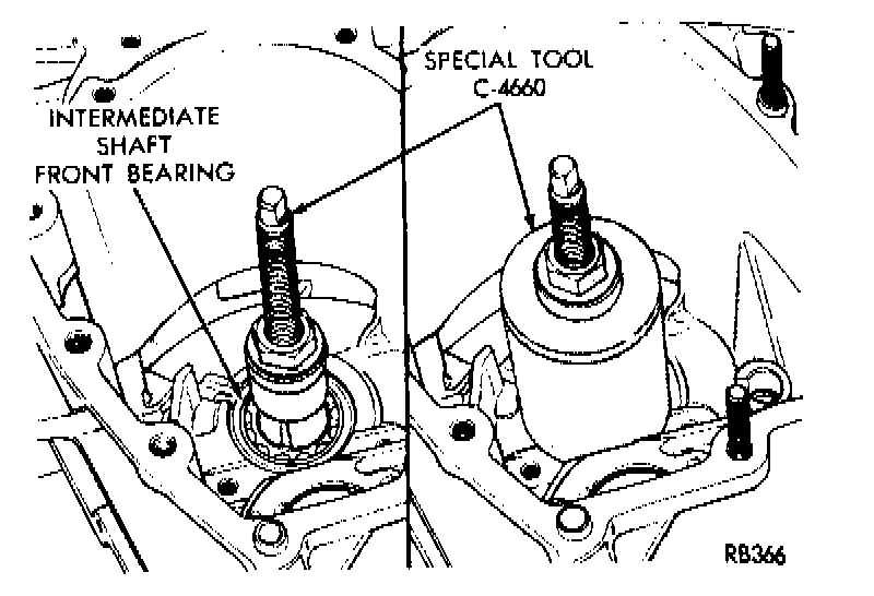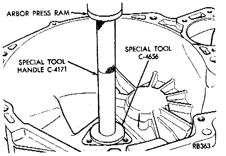 1. Using Tool L-4656 with Handle C-4171, press input shaft front bearing cup slightly forward in case. Then, using Tool L-4655 with Handle C-4171, press bearing cup back into case, from front, to properly position bearing cup, before checking input shaft end play (see input shaft front bearing cup replace in "Subassembly Recondition"). This step is not necessary if Tool L-4655 was previously used to install input shaft front bearing cup in the case and no input shaft (select) shim has been installed since pressing cup into case.