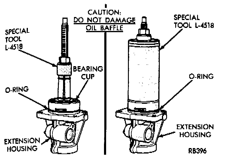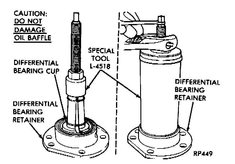7. Remove differential bearing retainer. Remove bearing cup and gauging shim. Properly install oil baffle. Be sure oil baffle is not damaged. Install shim(s) selected in step (6) and press in the bearing cup into differential bearing retainer.