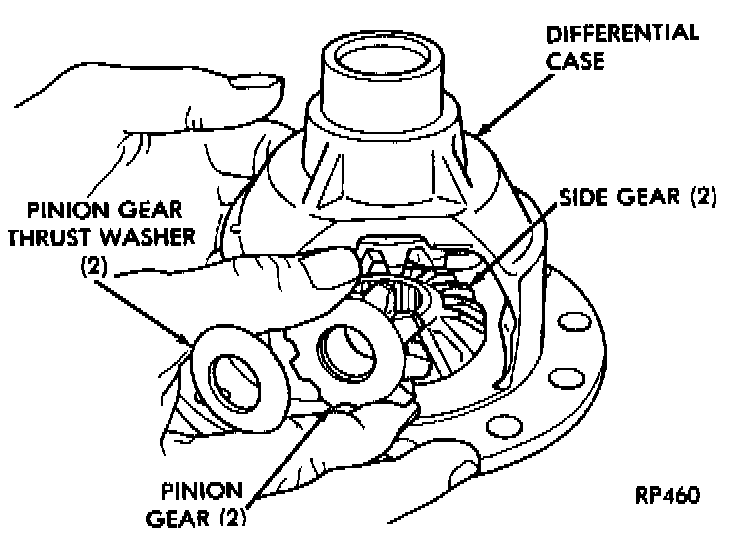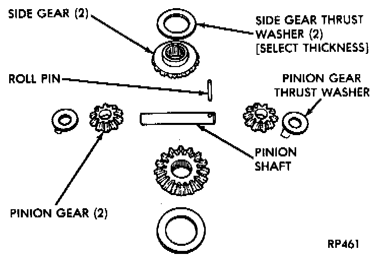 CAUTION: Side gear end play must be within 0.001 to 0.013 inch. 4 select thrust washers are available 0.032, 0.037, 0.042, and 0.047 inch.