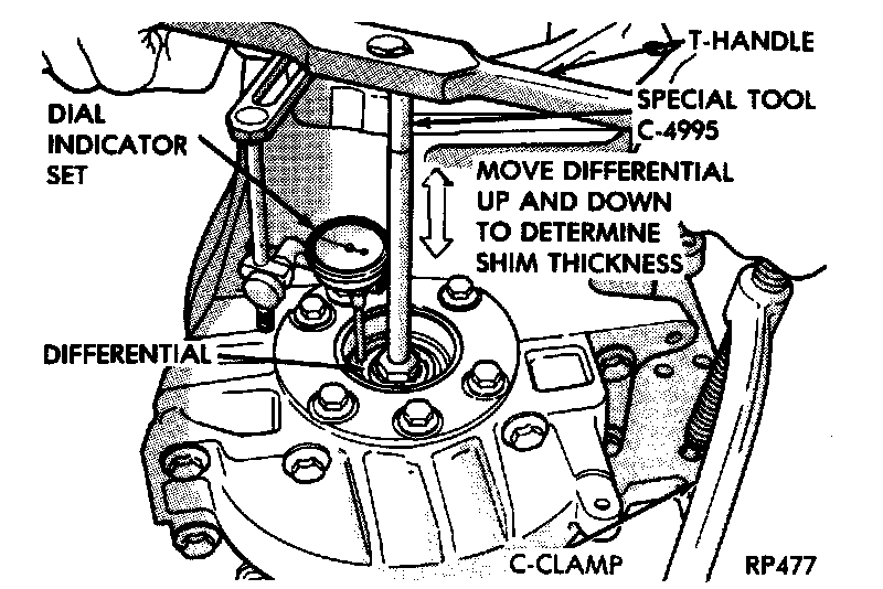 5. Apply a medium load to differential using Tool CA995 with T-Handle, in the downward direction while rolling differential assembly back and forth a number of times to settle bearings. Zero dial indicator. To obtain end play readings, apply a medium load in the upward direction while rolling differential assembly back and forth a number of times to settle out the bearings. Record end play.