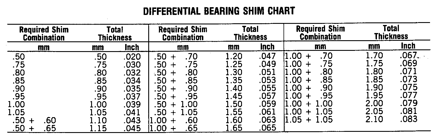 6. The Shim required for proper bearing preload is the total of the gauging shim thickness, plus end play, plus (constant) preload of 0.254mm (0.010 inch). Combine shims, if necessary, to obtain a shim within .05mm (0.002 inch) of the required shim (see Shim Chart for proper shim[s]).