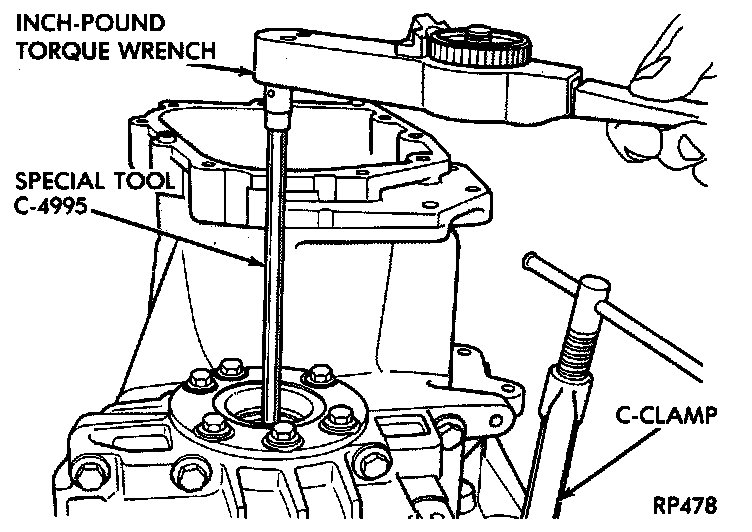 9. Using Special Tool C-4995 and an inch-pound torque wrench, check turning torque of the differential assembly in clockwise and counterclockwise directions. The turning torque should be 9 to 14 in. lbs. for new bearings or a minimum of 6 in. lbs. for used bearings. If the turning torque is too high, install a .05mm (0.002 inch) thinner shim. If the turning torque is too low, install a .05mm,(0.002 inch) thicker shim.
