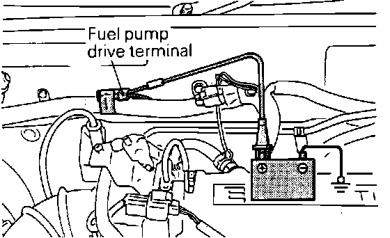 The fuel pump drive terminal (shown hooked-up) is located on the right side of the engine compartment on the firewall.