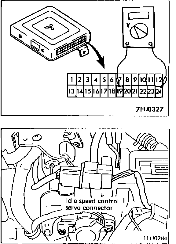 3. Connect a digital voltmeter between terminal 19 (throttle position sensor output voltage) of the engine control unit and terminal 24 (ground).
