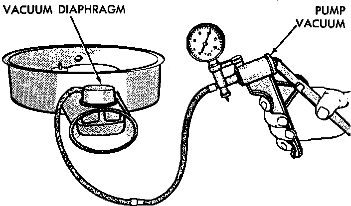 5. To test the vacuum diaphragm, apply 25 inches of vacuum with a vacuum pump. The diaphragm should not bleed off more than 10 inches of vacuum in 5 minutes. The door should not lift off the bottom of the snorkel at less than 5.5 inches Hg vacuum and should be in full up (heat on) position with no more than 8.5 inches Hg vacuum. If diaphragm does not operate properly, replace diaphragm.