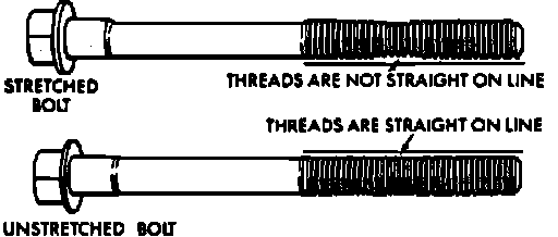 Inspect bolts as shown. Replace bolts if any sign of stretching is evident.