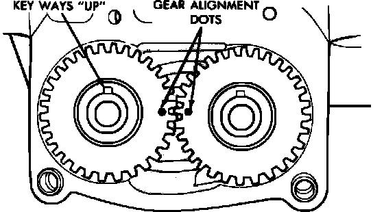 2. Rotate balance shafts until both shaft keyways are parallel to vertical centerline of engine, then install short hub drive gear on sprocket driven shaft. After installation, gear and balance shaft keyways must face up with gear timing marks meshed as shown, Fig. 31.