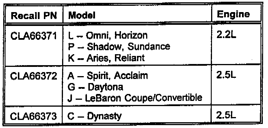 ^ 1989 Model Year Plymouth Acclaim; Dodge Daytona, Spirit and Dynasty; and Chrysler LeBaron Coupe and LeBaron Convertible Vehicles Equipped With a 2.5L Throttle Body Fuel Injected Engine, Automatic Transmission and Federal Emission Control Currently Located in a High Altitude State (Colorado, New Mexico, Nevada, Utah).