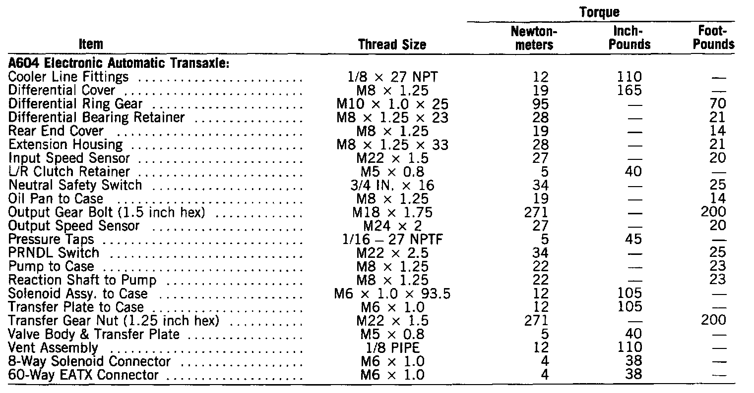 A-604, Torque Specifications: