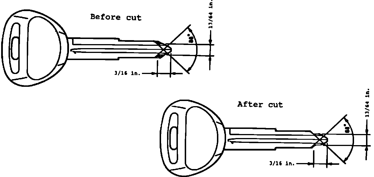 2. To make a valet key from the newly cut key, use a small file or stationary grinder to carefully cut out the hatched section shown in the illustration and remove all burrs.