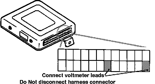 3. Connect a digital voltmeter between the illustrated terminals of the MPI Control Unit, without disconnecting the Control Unit from the harness.
