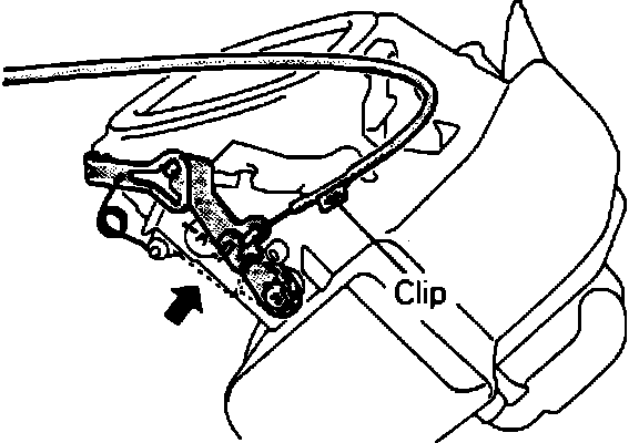 a. Place mode selector lever in defrost/vent position, then with mode selection damper lever pressed inward in direction indicated by arrow connect mode selection control wire to lever and secure outer cable using clip.
