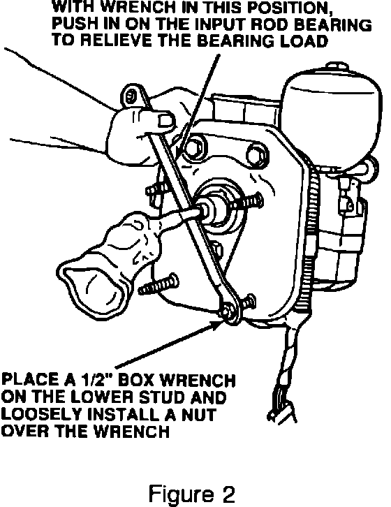 6. Place a 1/2" box end wrench over the lower mounting stud of the hydraulic unit, see Figure 2. Place a nut onto the stud and turn it enough to engage the threads 100%. Make sure that the wrench is aligned, as illustrated in Figure 2, on the input rod bearing.