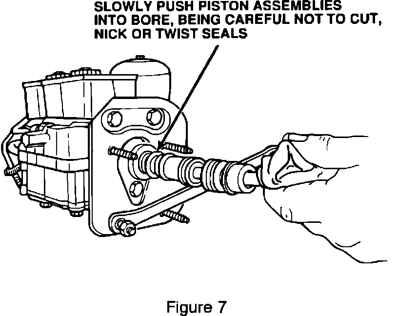 18. Slowly, push both piston assemblies into the actuator bore. Do not cut, nick or twist any of the seals, or the unit will not function properly.