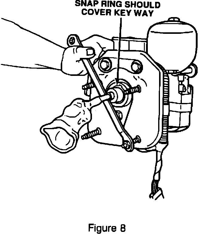 22. With the keyway at the top of the bore, in the 12 o'clock position, position the snap ring so that one end is in 10 o'clock position and the other end is in the 8 o'clock position, see Figure 8. The snap ring should cover the keyway at the 12 o'clock position.