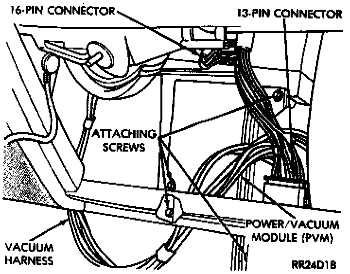 The power/vacuum module (PVM) is located in the heater, A/C housing above and to the right of the floor hump.