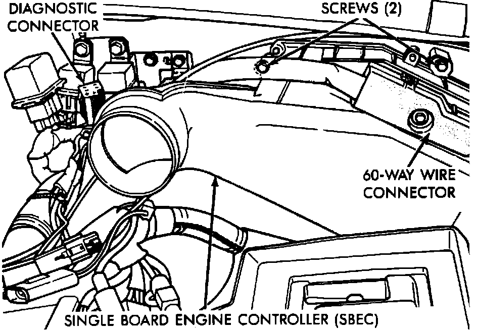 The Diagnostic Connector is found on the left side of the engine compartment, near the Single Board Engine Controller (SBEC).