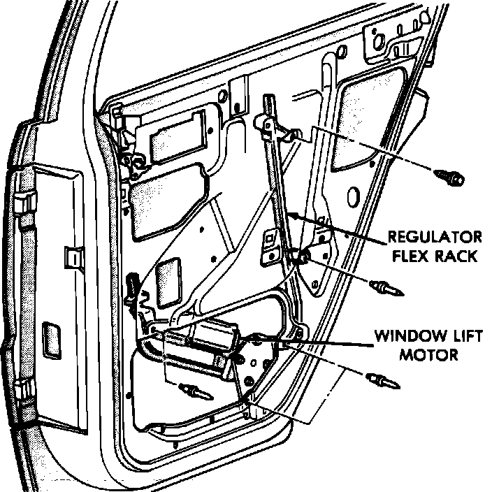 The front window regulator is a conventional sector gear design. The rear window regulator is a flex drive design. The power window motor is attached to the window regulator. The window motor/regulator assembly is attached to the inner door panel of each door.
