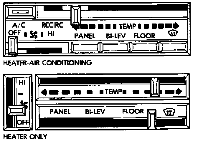 These systems both draw outside (ambient) air through the cowl opening, into the plenum chamber of the heater-A/C unit housing. On air-conditioned vehicles, the air then passes through the evaporator. At this point, the air flow can be directed either through or around the heater core by adjusting the blend-air door with the TEMP lever on the instrument panel control. Then, the air flow can be directed from the PANEL outlets, BI-LEVEL (panel and floor) outlets, FLOOR DEFROST (side window demister if so equipped) outlets. The airflow velocity can be adjusted by the blower speed selector switch on the instrument panel control.