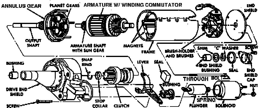 Bosch gear reduction starters use six permanent magnets in place of conventional, wound field magnets, to save weight, eliminate field winding to case shorts, and improve cold start performance. The gear reduction system uses a planetary gear train to transmit armature rotation to the pinion shaft. A solenoid switch is mounted on the starter motor drive end shield.